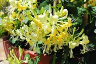 • Fragrant climbing vine with tubular flowers in pink, white, and yellow.